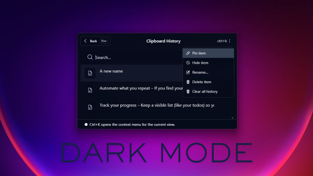 Never lose what you copied. Search through unlimited history. Pin, rename, hide, or organize any item. Smart type detection for text, JSON, URLs, emails, HTML, images, and more.