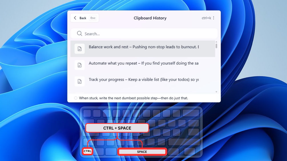 Built for speed. Press Ctrl+Space anywhere on Windows, search instantly, paste immediately. No mouse required.